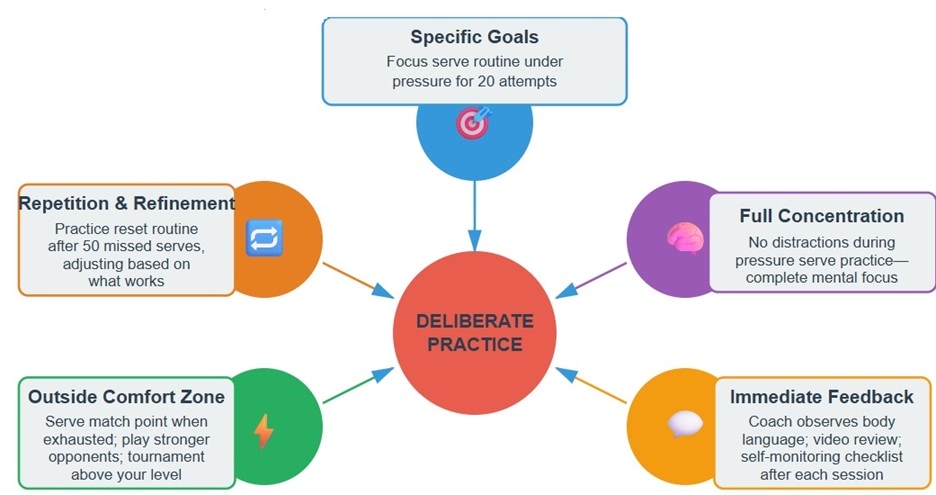 - Set Process-Oriented Goals. Instead of “win the tournament,” set goals like “execute my focus routine between every point” or “implement breathing strategy when trailing.” These goals are within your control and directly target mental skills, following Ericsson’s principle of specific, measurable objectives. See more tips in Set SMART Process Goals: Focusing on the Journey Over the Destination.