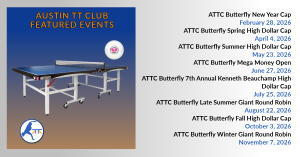 AUSTIN, TX – The Austin Table Tennis Club (ATTC) is proud to announce a high-stakes 2026 tournament schedule, featuring the ATTC Butterfly Mega Money Open in June. Designed as an elite “tune-up” for the US Nationals, this marquee event will feature a non-sanctioned Open event with a $3,000 grand prize for the first-place winner.